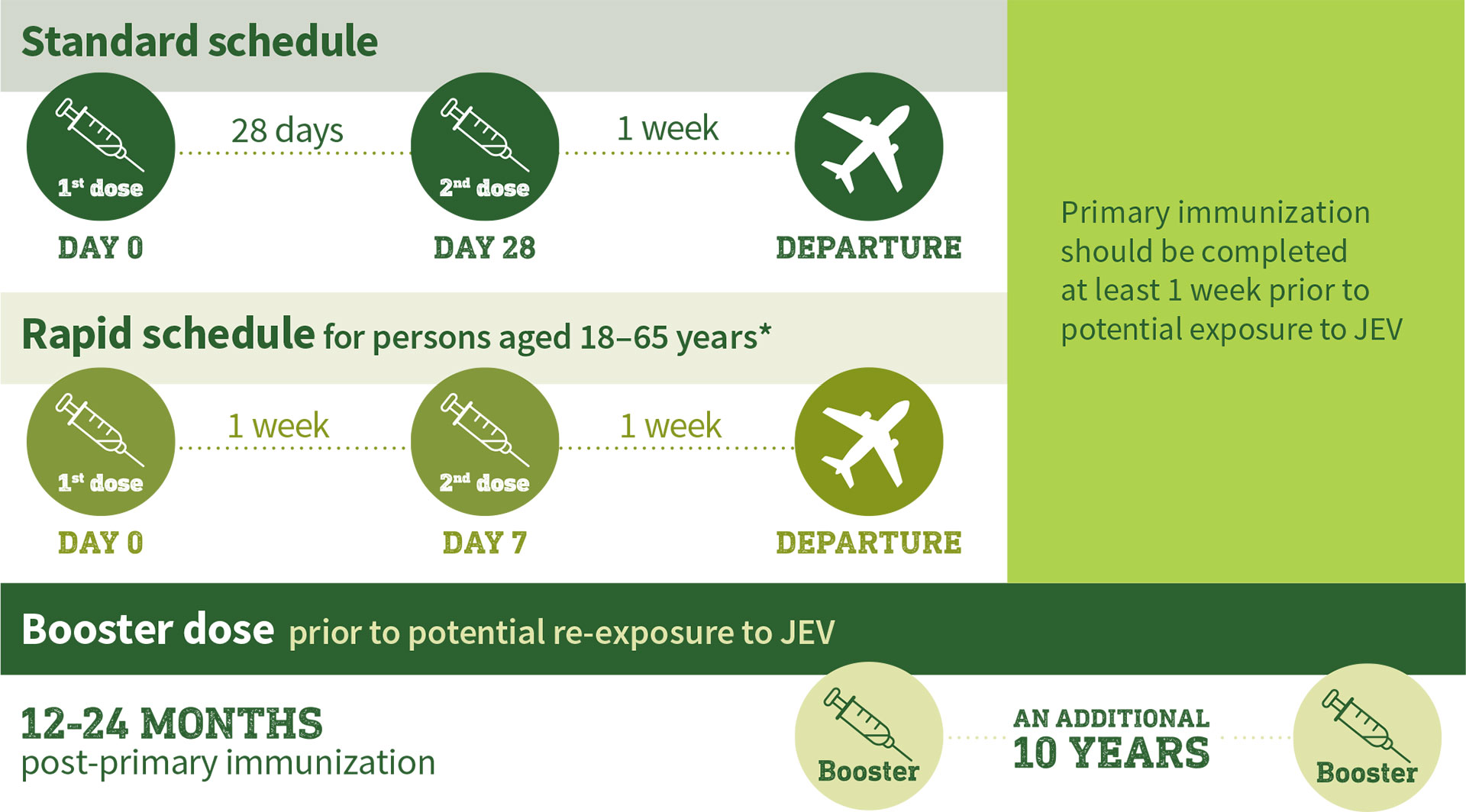 A booster dose should be given within the second year (12 – 24 months) after primary immunization, prior to potential re-exposure to JEV.
