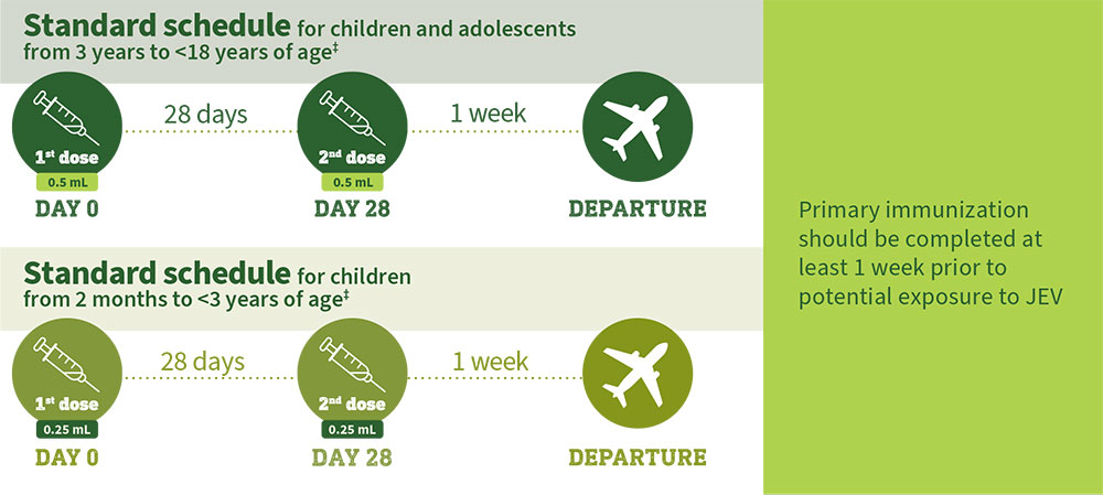 IXIARO® (Japanese Encephalitis vaccine inactivated, adsorbed), administered in a 2-dose vaccine schedule, is the only JE vaccine available in Canada.22