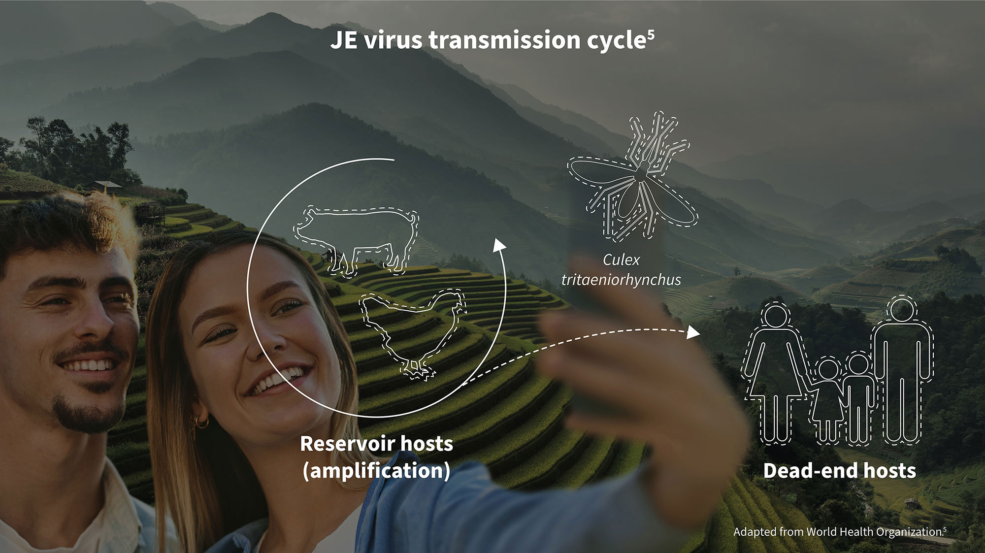 A traveller to any of 24 Asia-Pacific countries, including parts of Australia, can be infected with the JE virus (JEV). In rare cases, JE viral infection can result in encephalitis.5,6