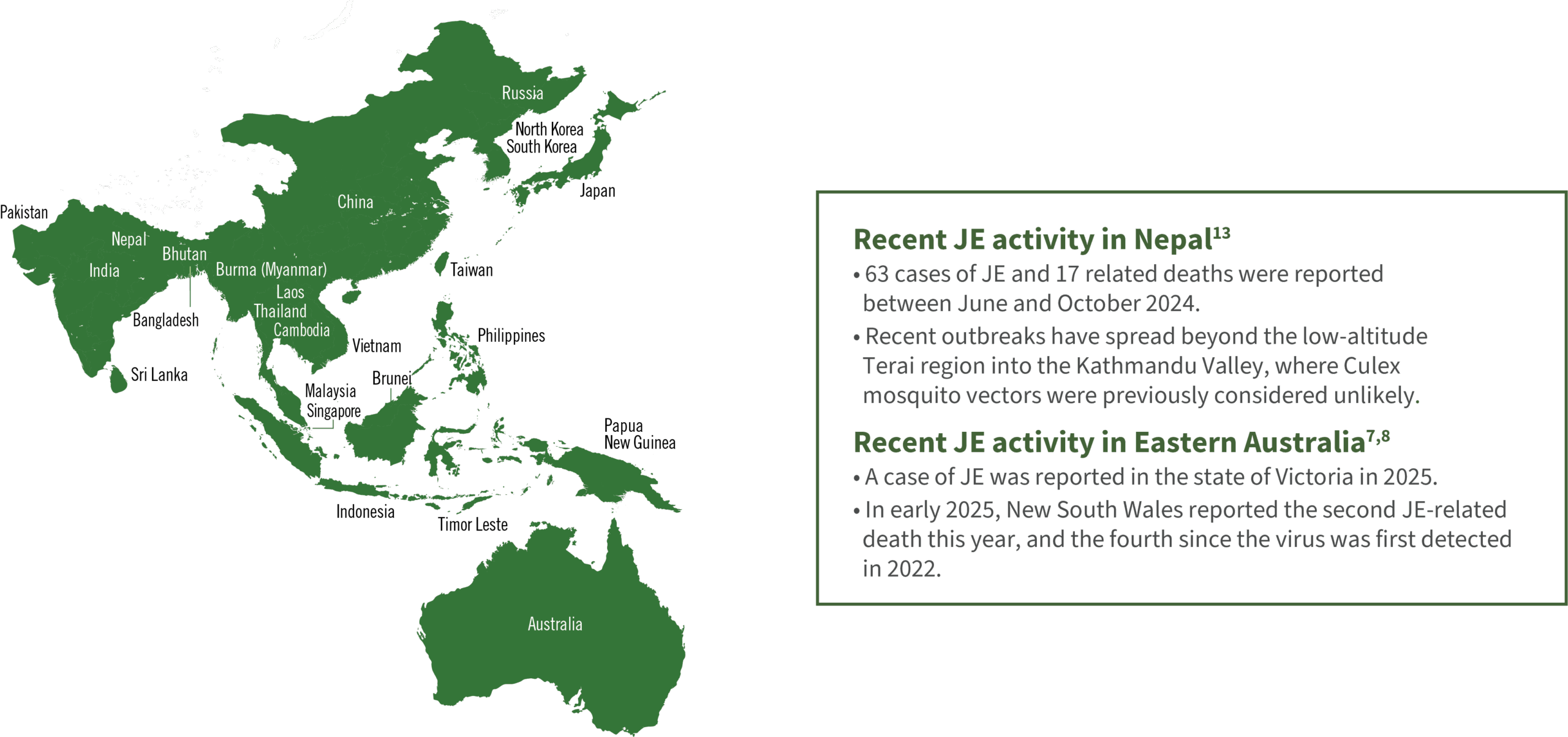 JE is one of the most common causes of viral encephalitis in Asia with an estimated 100,000 clinical cases worldwide every year.* JE may be underreported due to inadequate surveillance in many Asian countries where the virus is endemic.4,5,9
